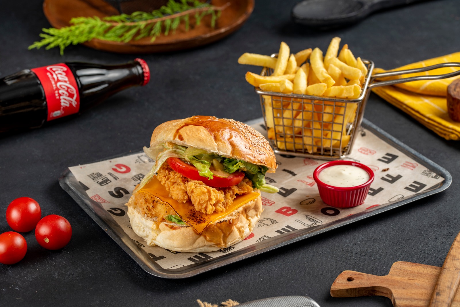 Çıtır Tavuk, cheddar, çıtır soğan, marul, domates, relish turşu, özel sos, yanında patates kızartması ile