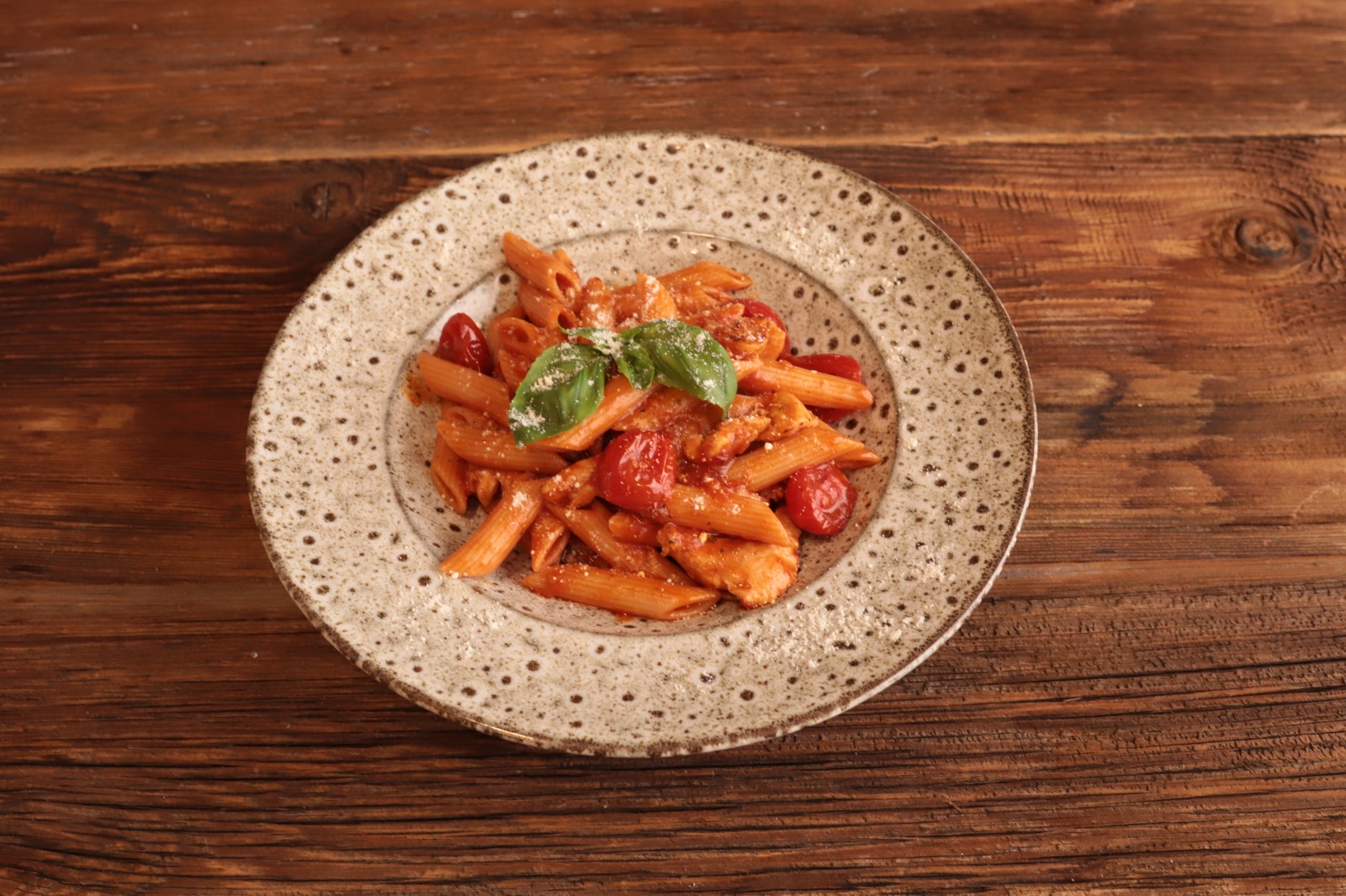 Tereyağında kavrulmuş jülyen tavuk bonfile, soğan, sarımsak, kuru domates, napolitan sos, taze fesleğen ile