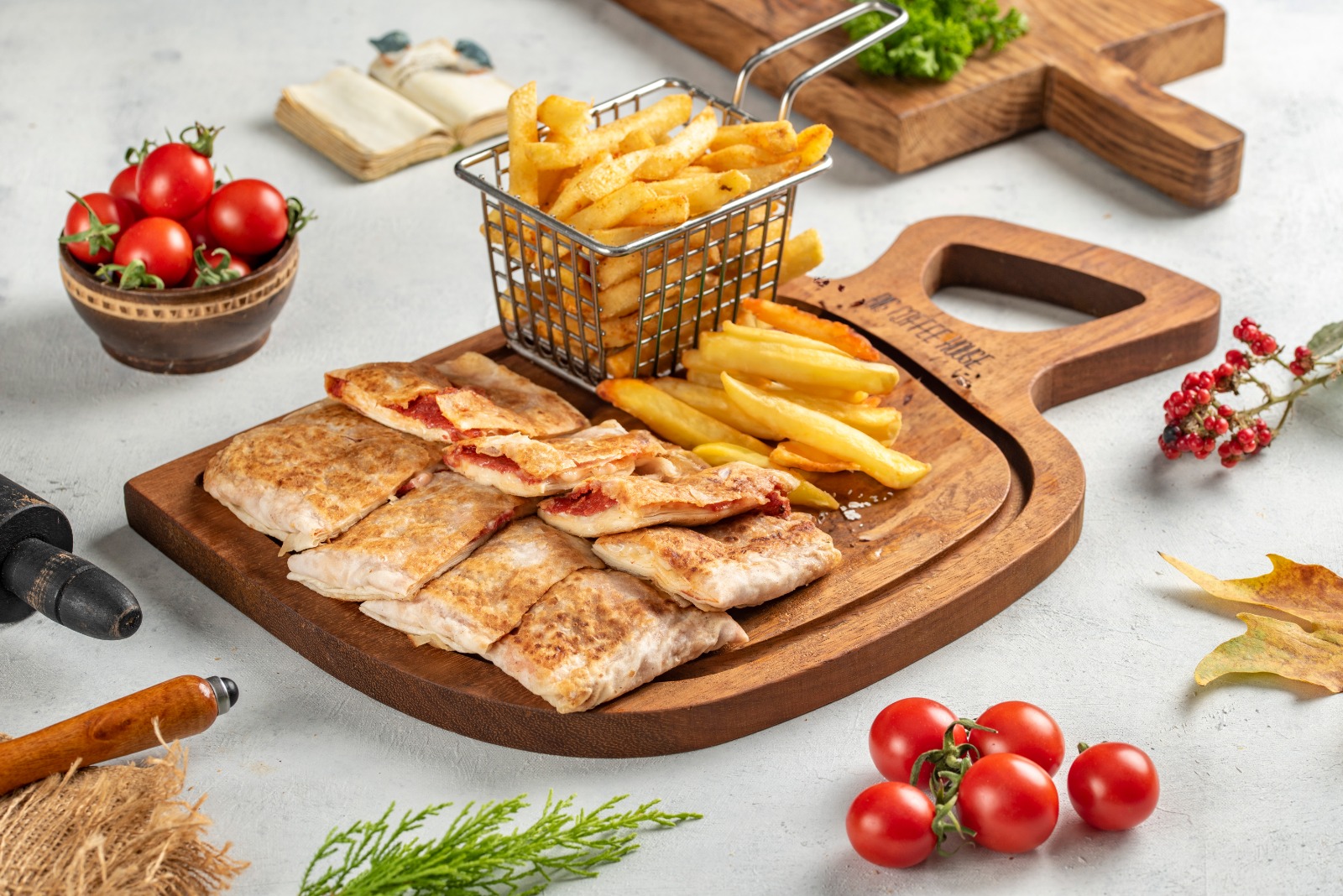 Julyen sosis, renkli biberler, soğan, kaşar peyniri, acılı napolitan sos