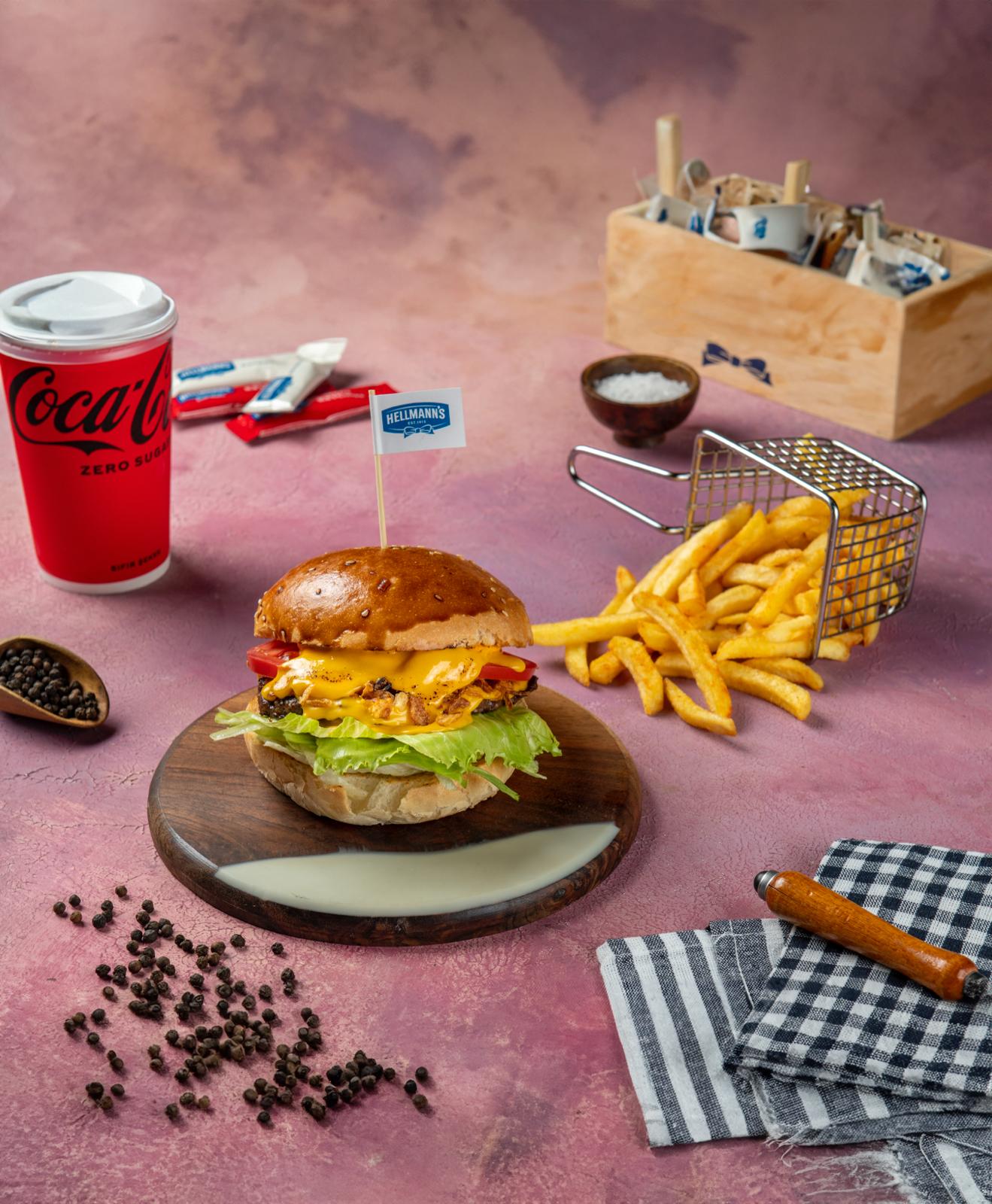 120 gr. ev yapımı burger köftesi, cheddar peyniri, karamelize soğan, dana füme et, bbq sos, marul, domates, özel sos, soslu patates kızartması