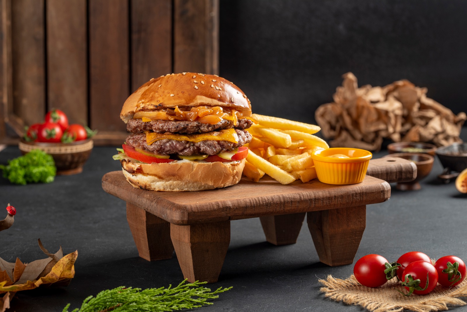 Tek burger ekmeğinde, 2 adet 120 gr. ev yapımı burger köftesi, double cheddar peyniri, karamelize soğan, marul, domates, soslu patates kızartması, ketçap, mayonez ile