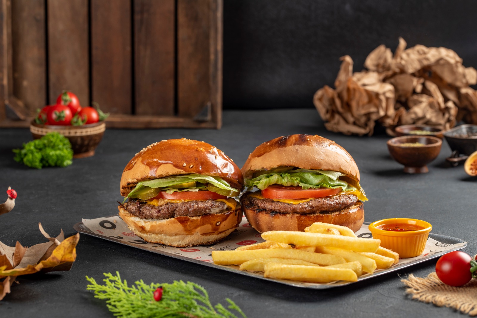 120gr Ev Yapımı Burger Köftesi, Cheddar Peyniri, Göbek Marul, Domates, Özel Soslu 2 Adet Hamburger, Yanında Soslu Patates Kızartması
