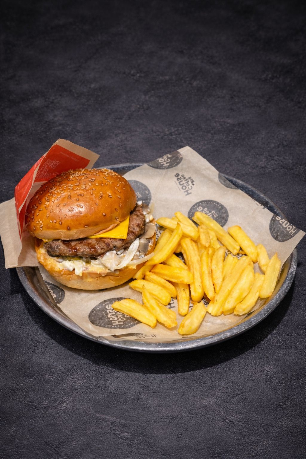 120gr burger köftesi,krema ile sotelenmiş mantar, soğan, cheddar peyniri, soslu patates kızartması