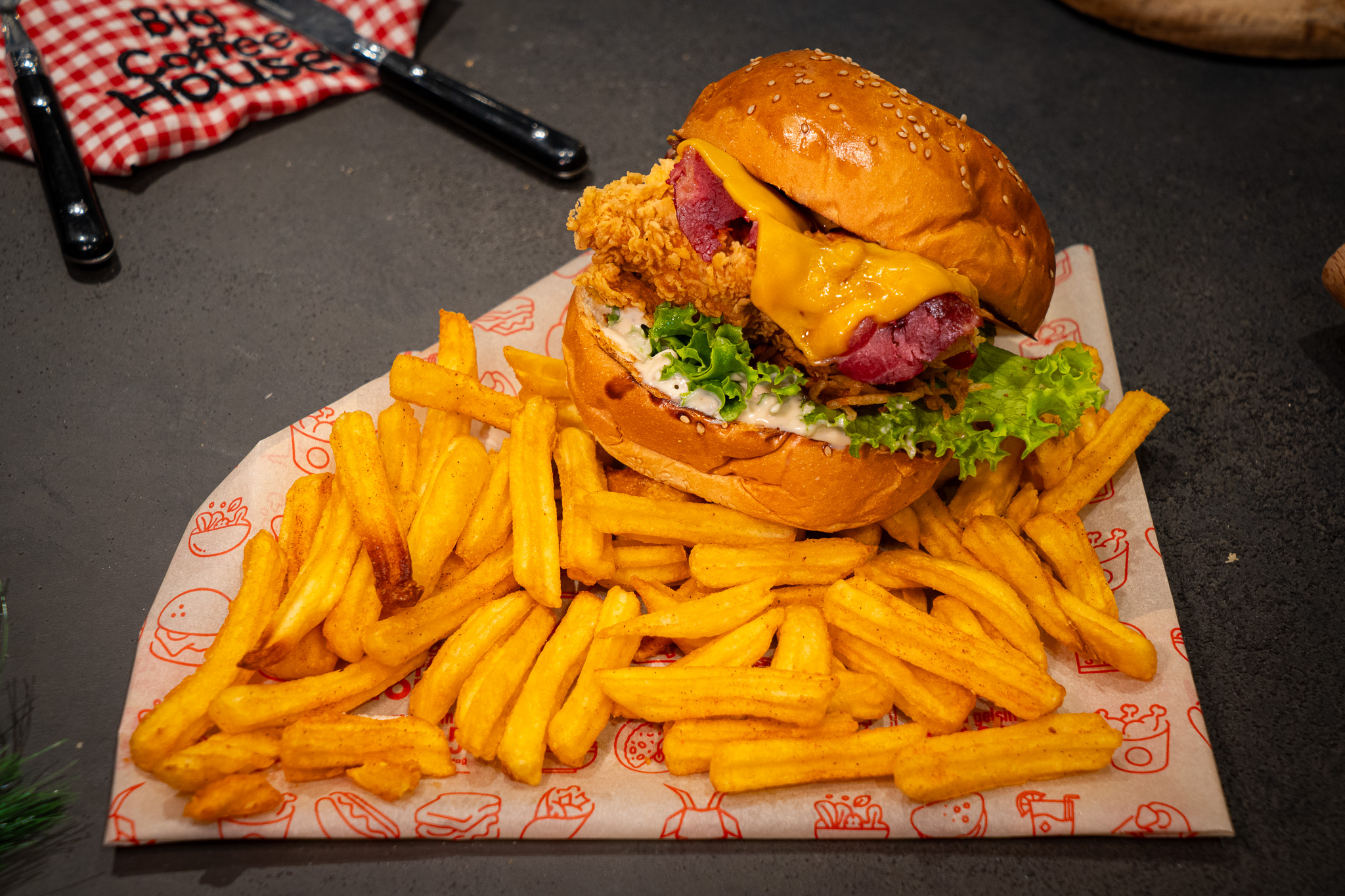 Çıtır tavuk (120 g), cheddar peyniri, burger bacon, demi glace sos, turşu ve patates kızartması ile