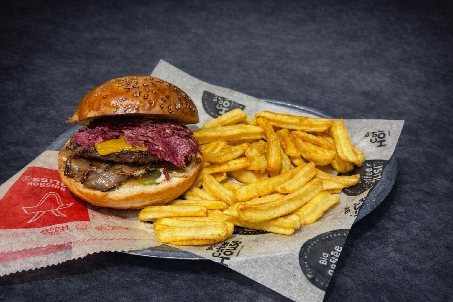 120 g ev yapımı köftesi, istiridye mantarı, karamelize soğan, burger bacon, cheddar peyniri, trüf mantarlı mayonez, yanında soslu patates kızartması