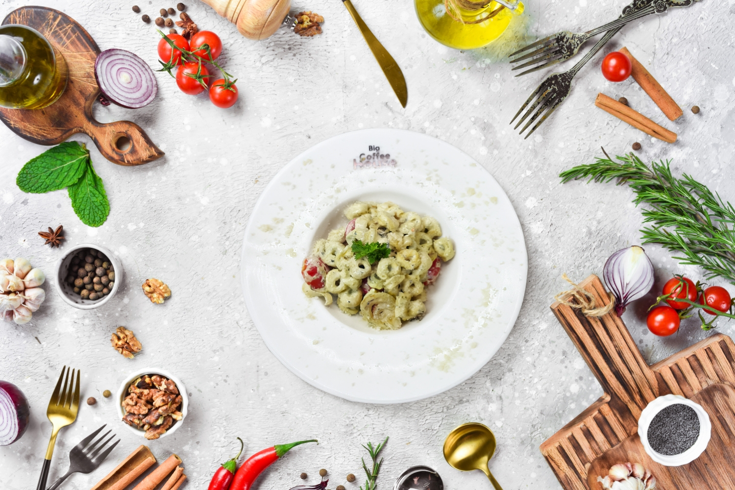 Tereyağında kavrulmuş soğan, sarımsak, cherry domates, taze fesleğen, 4 peynirli tortellini, krema