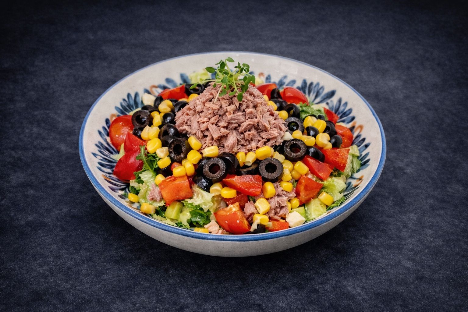Ton balığı, Akdeniz yeşillikleri, domates, mısır, közlenmiş kapya biberi,zeytin, soğan turşusu , zeytinyağlı limonlu sos