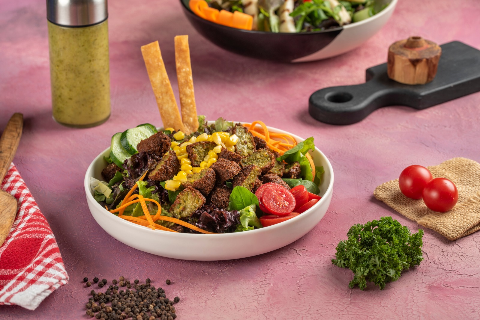 Falafel topları, Akdeniz yeşillikleri, taze nane, yeşil soğan, cherry domates, közlenmiş kapya biber ,mısır, nar ekşili sos