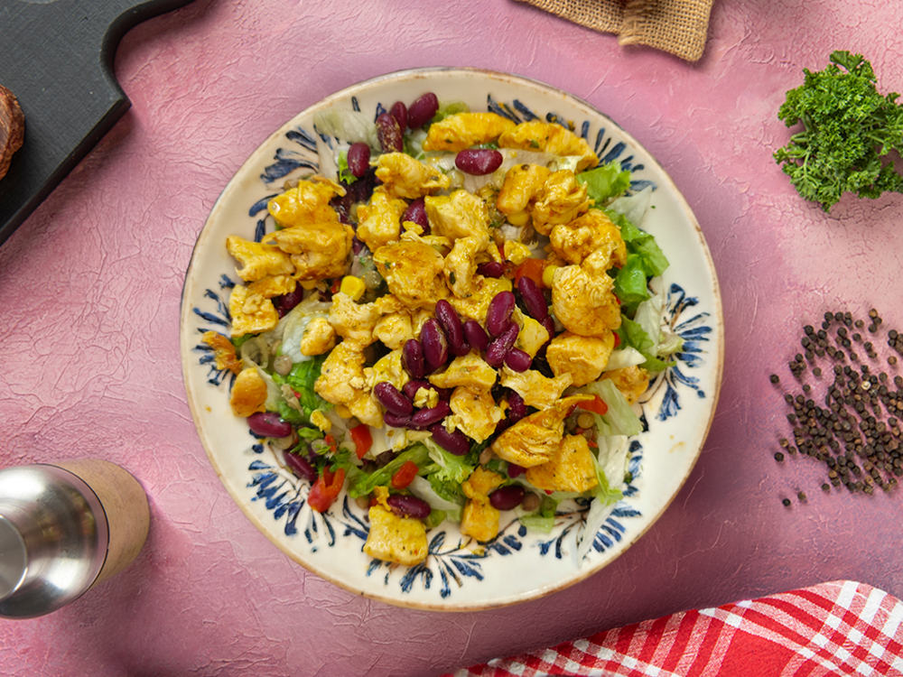 Akdeniz yeşillikleri, fajita baharatlı ızgara tavuk göğsü, kaşar peyniri, renkli biberler, Meksika fasulyesi, zeytinyağlı limon sos ile