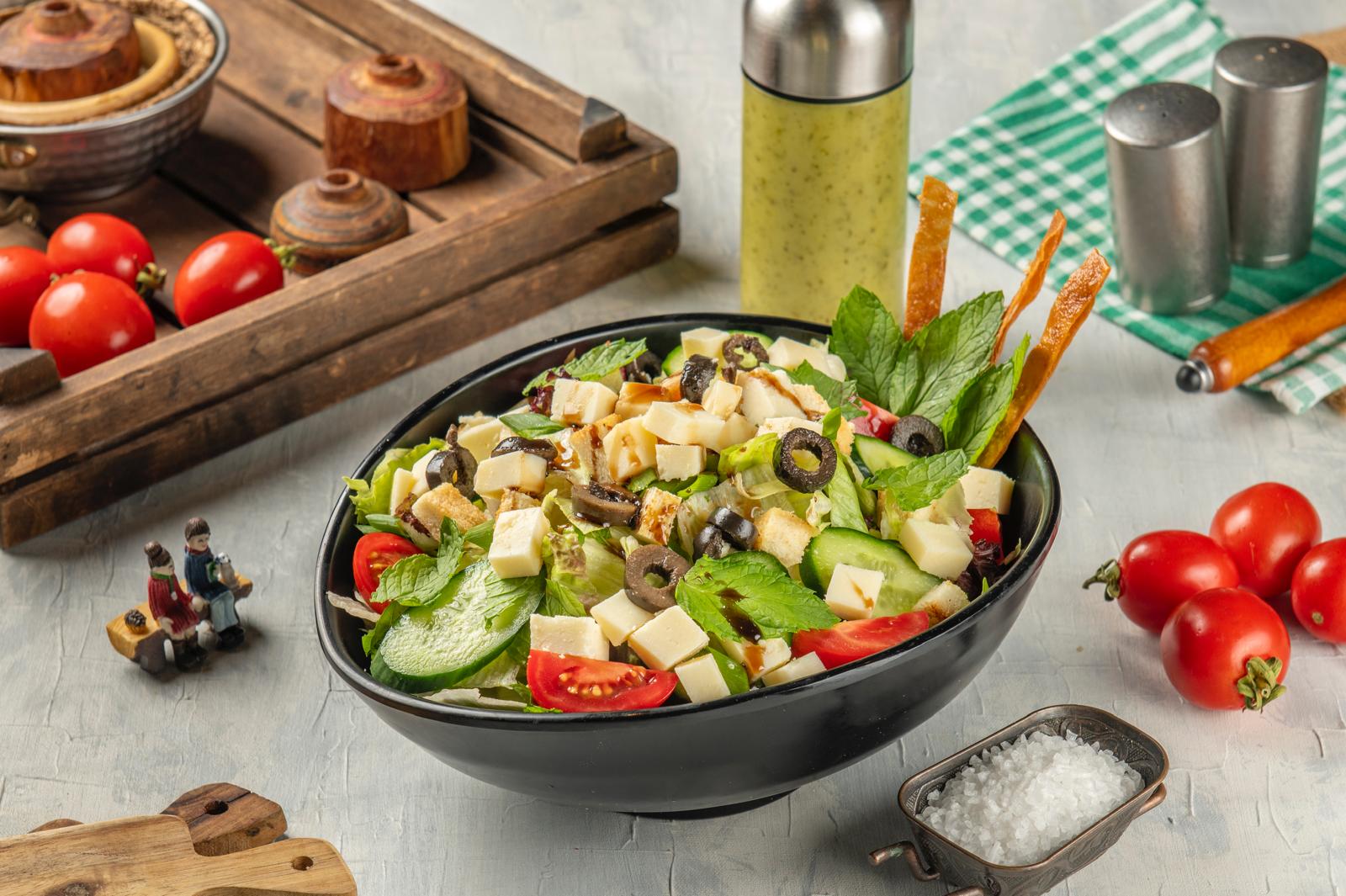 Akdeniz yeşillikleri, roka, salatalık, beyaz peynir, dilim zeytin, mısır, domates ve akdeniz salata sosu ile