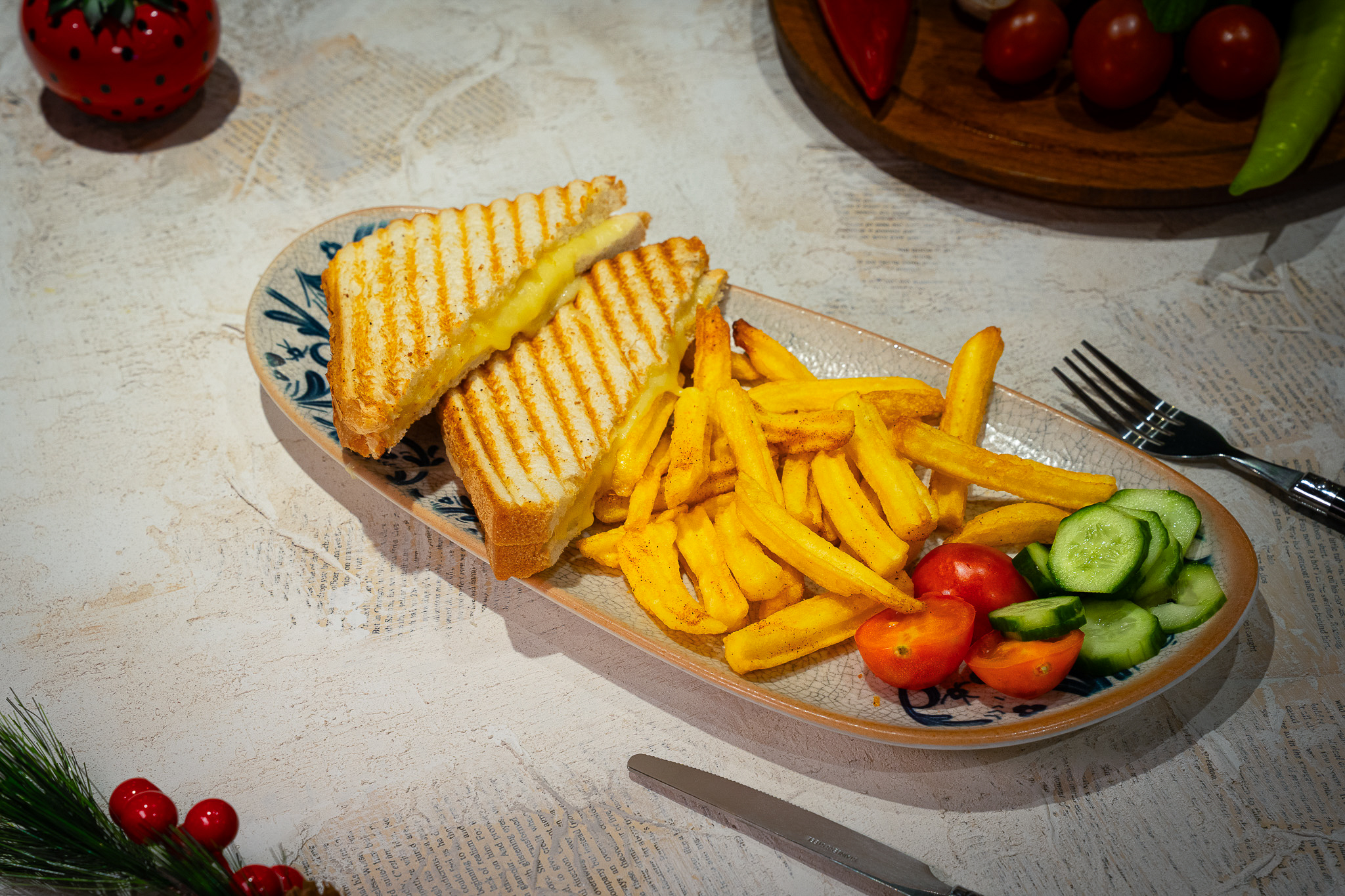 Cherry domates, salatalık, özel soslu patates kızartması ile