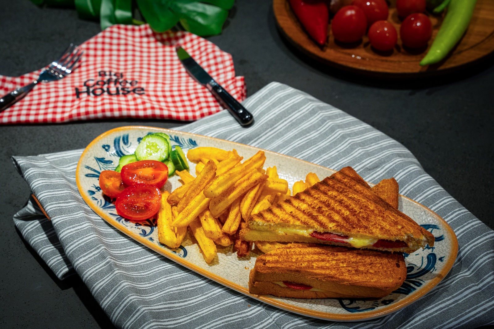 Sucuk, kaşar peyniri. Cherry domates, salatalık, özel soslu patates kızartması ile