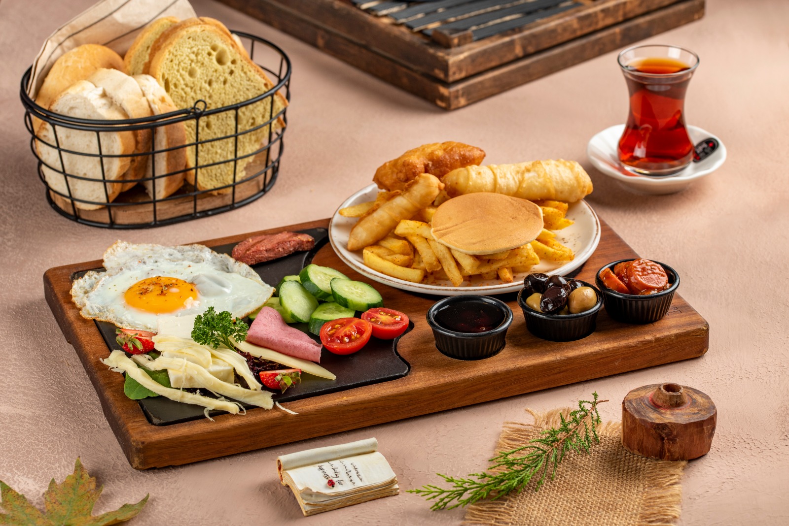 Pişi, paçanga böreği, sigara böreği, göz yumurta, kasap sucuğu, sosis, salam, reçel, patates kızartması, ketçap , mayonez, domates, salatalık, siyah zeytin , yeşil zeytin, kaşar peyniri, beyaz peynir