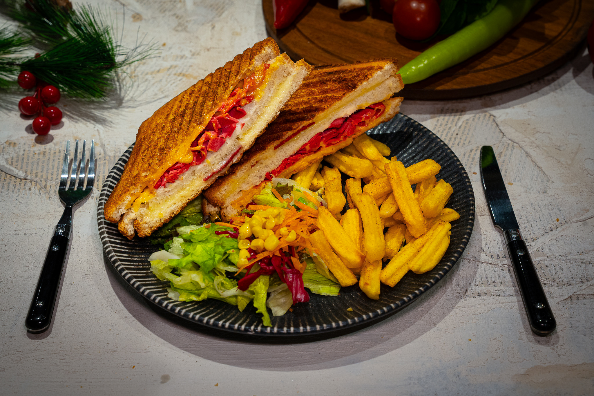 Bazlama ekmeği içinde özel sos, avakadolu mayonez, sosis, salam, sucuk, cheddar peyniri, yanında Akdeniz yeşillikleri ve patates kızartması ile servis edilir