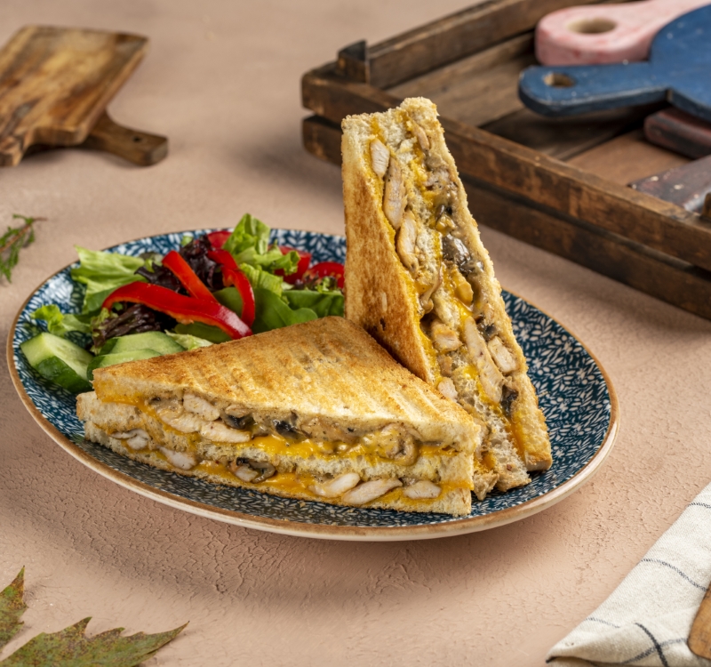 3 Katlı büyük boy tost ekmeği içinde cheddar peyniri, kremalı tavuk, mantar, yanında Akdeniz yeşillikleri ve patates kızartması ile servis edilir