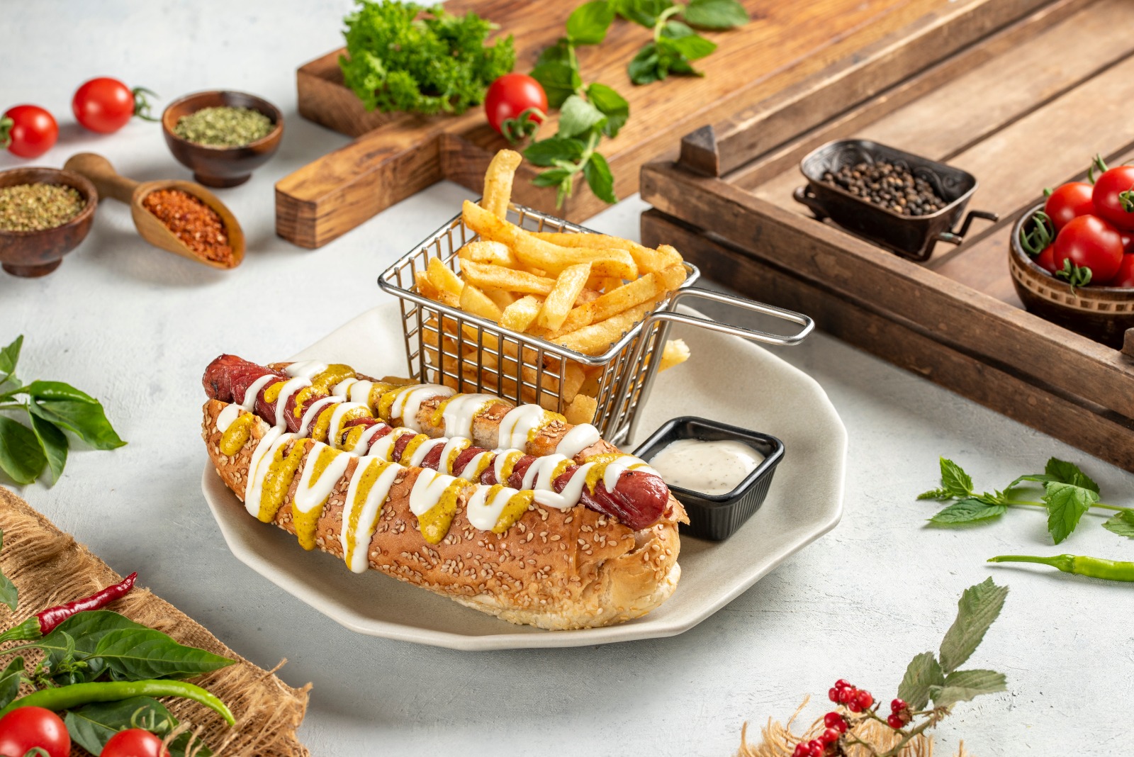 Dana frankurter sosis, mayonez, relish turşu, karamelize soğan, cheddar peyniri. Soslu patates kızartması, ketçap , mayonez ile