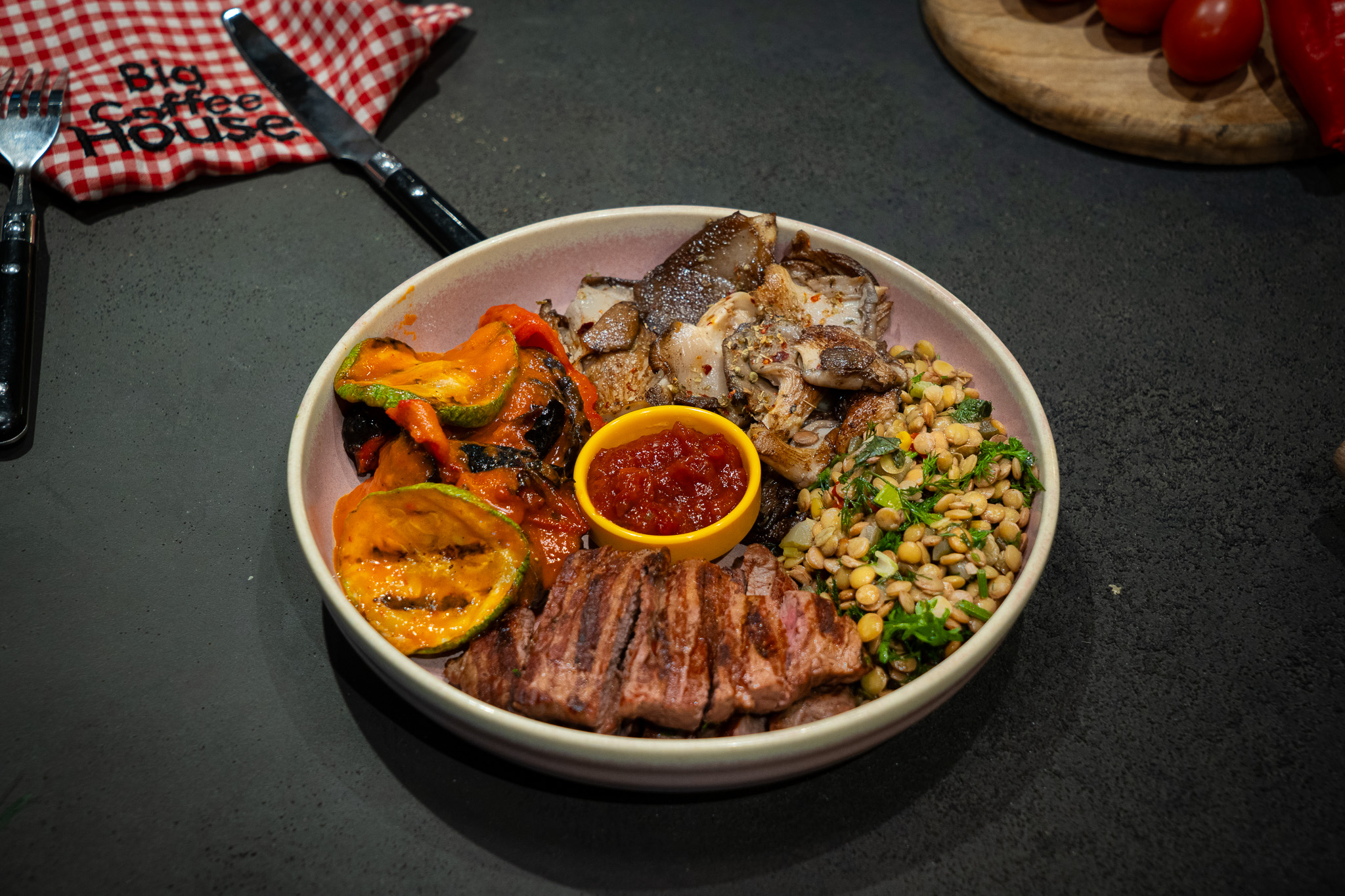 Izgara dana bonfile, Buharda Pişilmiş Brokoli, Karnabahar, Havuç, Kabak, Köz Biber, Haşlanmış Nohut, Akdeniz Yeşilliği, Siyah buğday (greçka) ile servis edilir