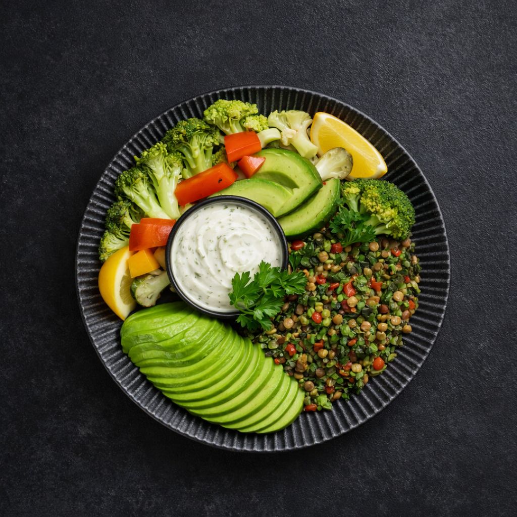 Buharda pişirilmiş brokoli, karnabahar, havuç, renkli biberler, Meksika fasulyesi, kuru cacık ile servis edilir