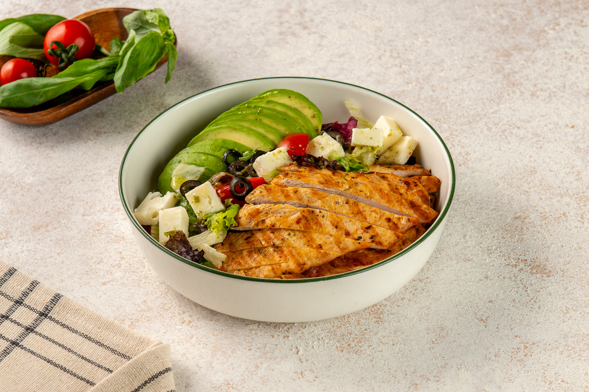 Izgara tavuk bonfile (200 g), avakado, dilim zeytin, cherry domates, akdeniz yeşillikleri, roka, beyaz peynir ve akdeniz sos ile