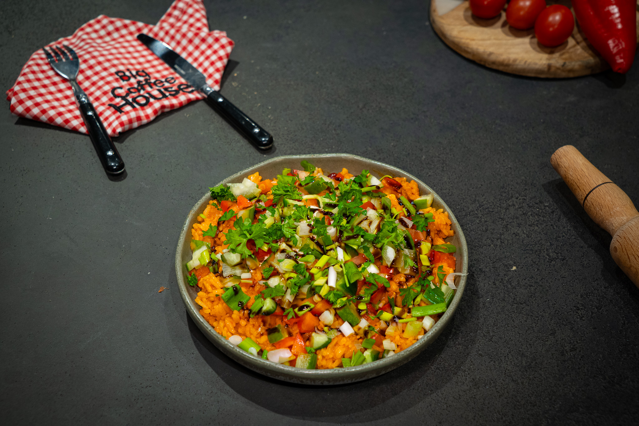 Pilav, salça ile kavrulmuş jülyen tavuk bonfile, meksika fasulyesi, ekşi krema, kaşar peyniri, domates, soğan, köy biberi, iceberg marul