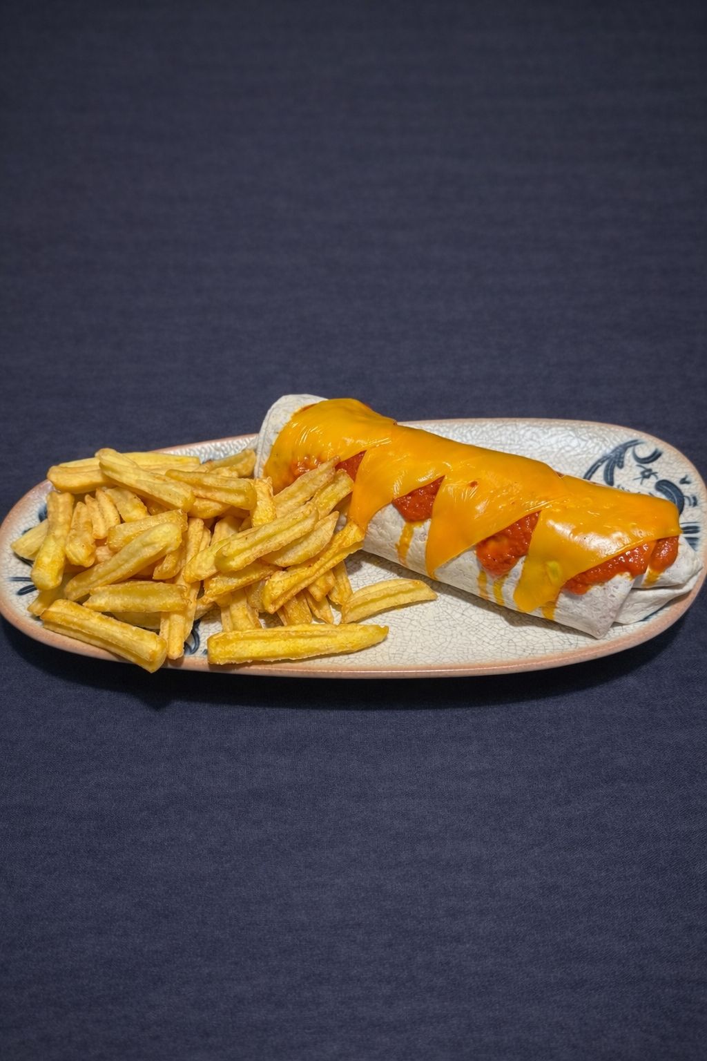 Tortilla ekmeğine sarılmış, Pilav, Salça ile kavrulmuş julyen tavuk, Meksika fasulyesi, Ekşi krema, Kaşar peyniri, Domates, Soğan, Köy biberi, Iceberg marul yanında Akdeniz yeşillikleri ile.