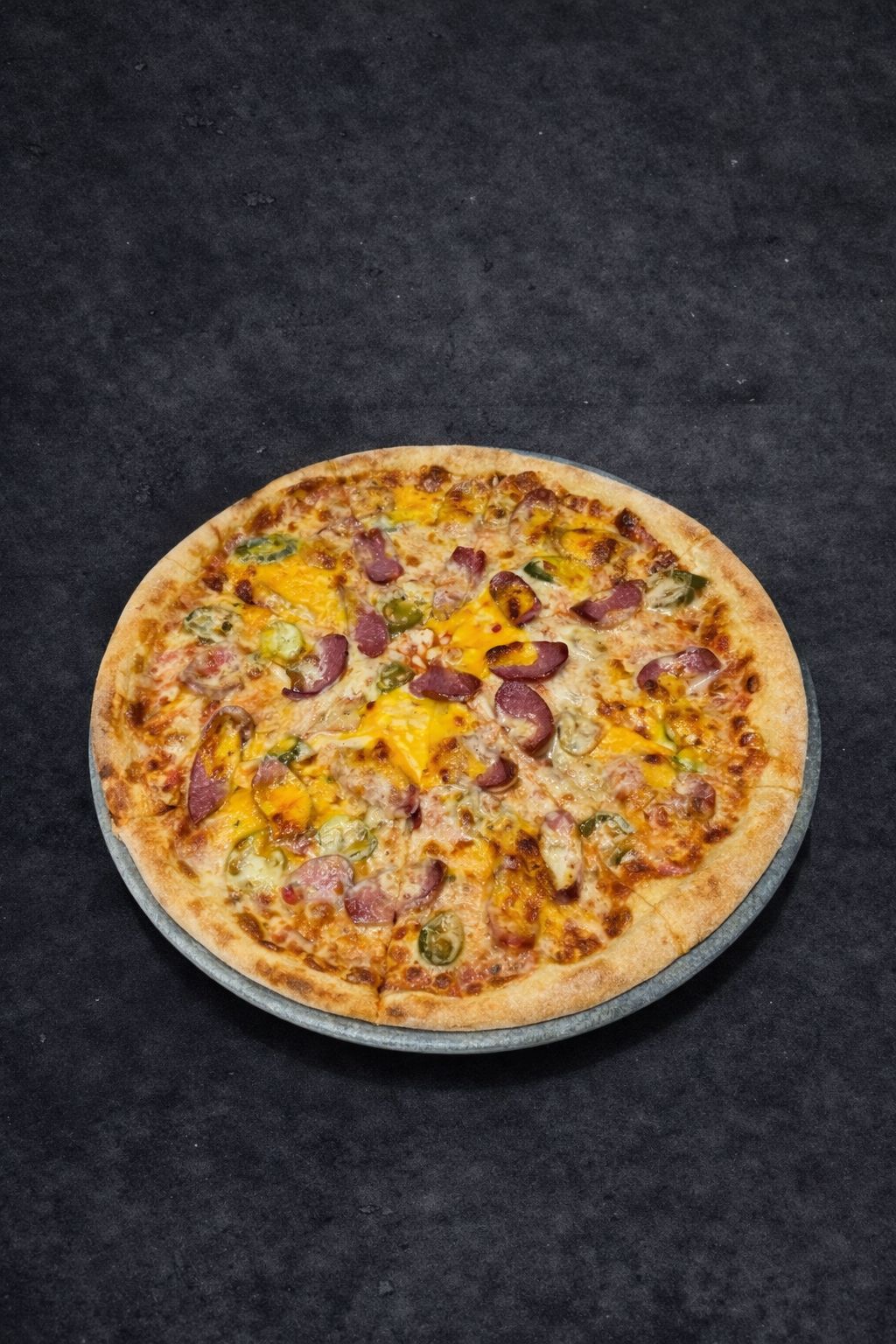 Mozzeralla Peyniri, Ev Yapımı Özel Domates Sos, Jalapeno Biberi, Frankfurter Sosis Dilimleri, Acılı Ketçap, Cheddar Peyniri