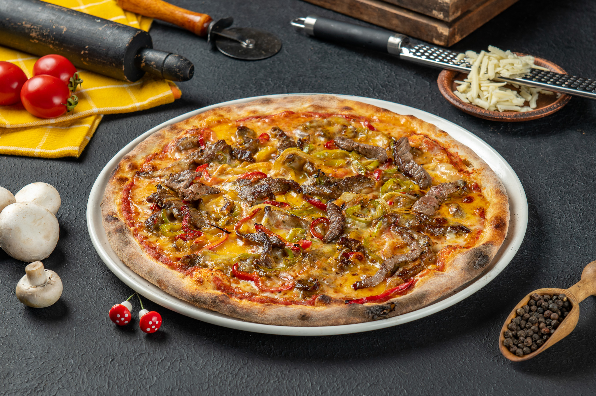 ozzarella peyniri, ev yapımı özel domates sos, julyen kesim dana bonfile,