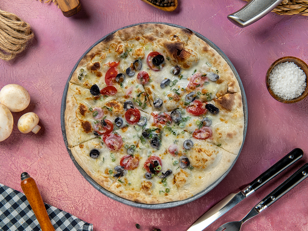 Mozzarella peyniri, kiraz domates, siyah zeytin, taze soğan, sarımsak ve roka