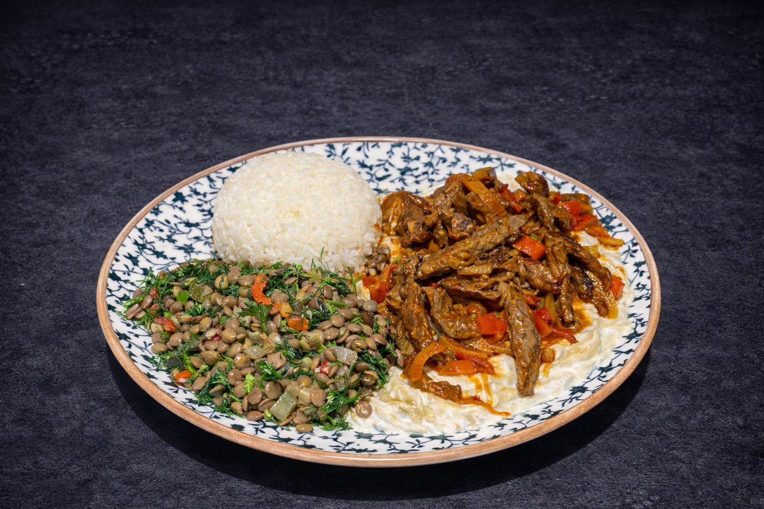 Köz patlıcan, köz biber, yoğurt, özel soslu, domatesli küp dana bonfile, tereyağlı salçalı sos, patates kızartması, Akdeniz yeşillikleri