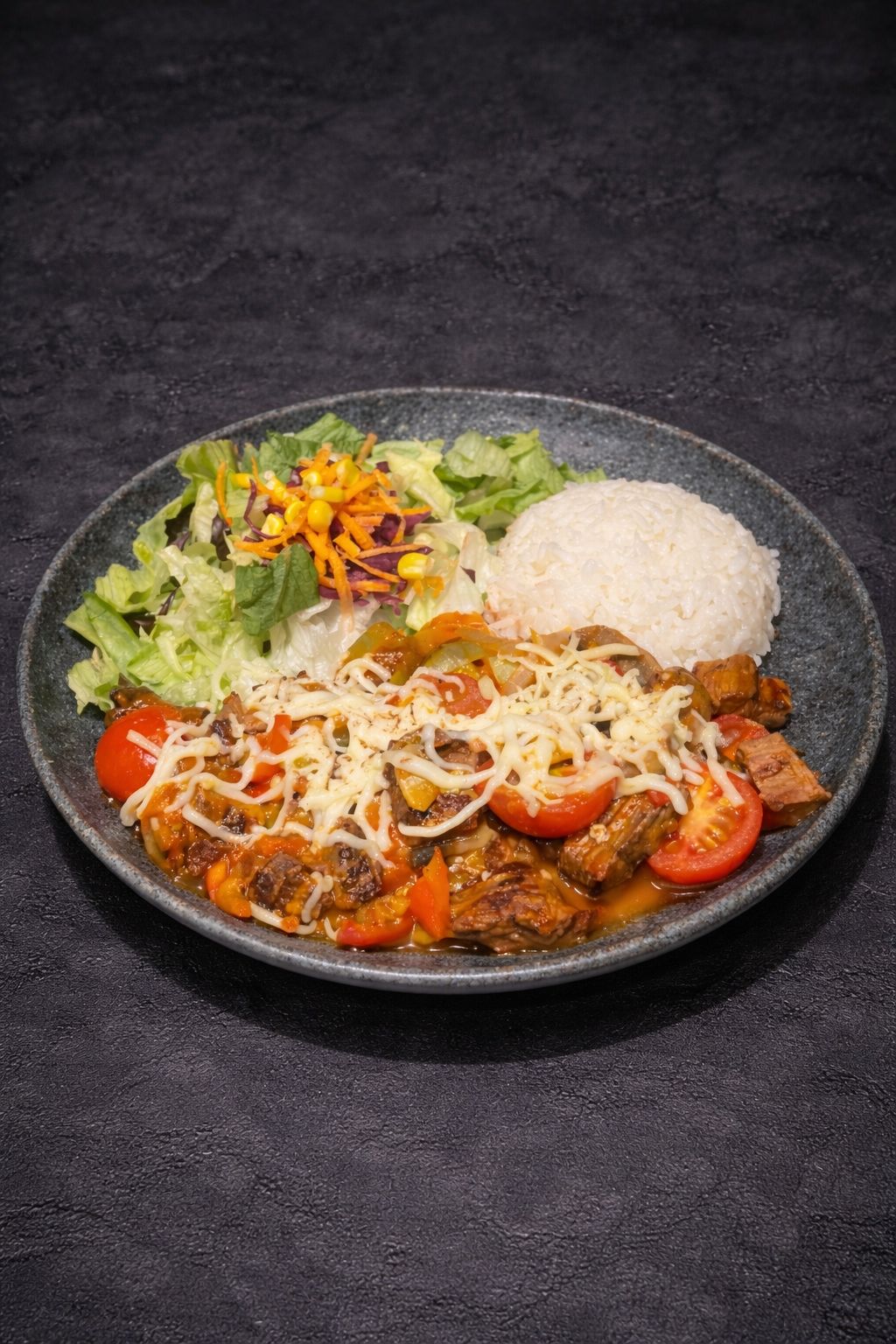 Dana kuşbaşı bonfile (200 gr.), soğan, kapya biber, köy biberi, mantar, domates, üzerinde fırında eritilmiş kaşar peyniri, yanında Akdeniz yeşillikleri, acılı arpa şehriye pilavı, patates kızartması, salsa sos, sezar sos ile servis edilir