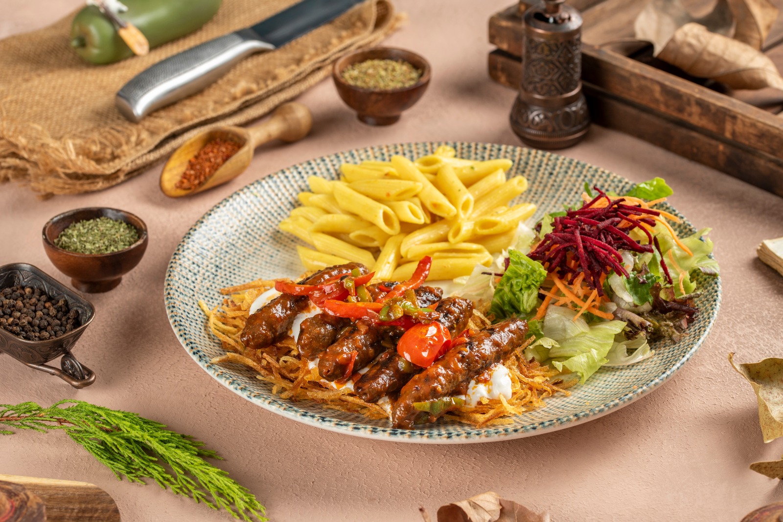 Süzme yoğurt yatağında, tereyağında domates, renkli biberler ve özel sos ile sotelenmiş çöp şiş ızgara köfte, yanında özel soslu makarna, Akdeniz yeşillikleri ile servis edilir