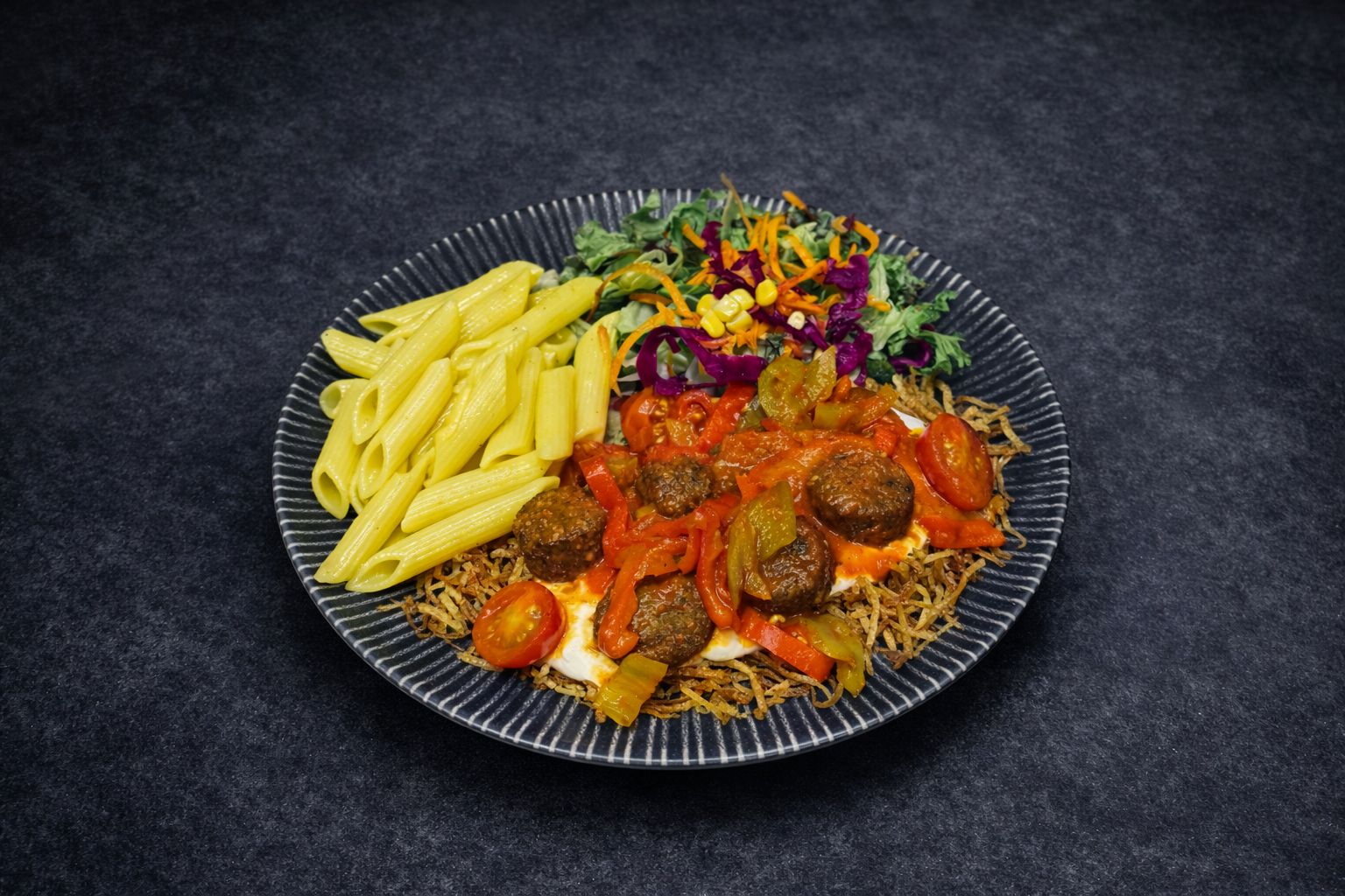 Kibrit patates, süzme yoğurt, tereyağılı domates, renkli biber , özel sos, falafel köfte, özel soslu makarna ve akdeniz yeşillikleri ile