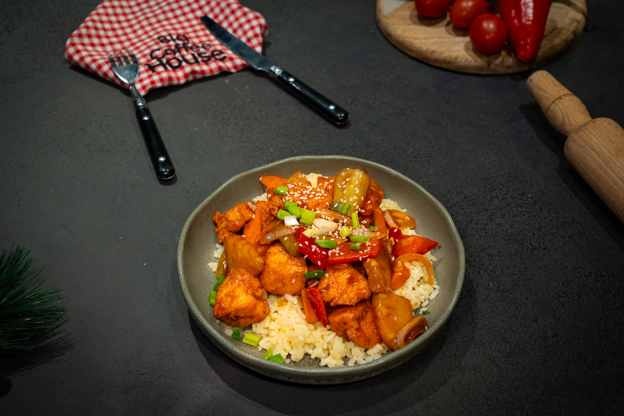 Çıtır tavuk, Barbekü sos, Acı sos, Tatlı acı sos, Pirinç sirkesi, Tatlı ekşi sos, Ananas, Susam, Taze soğan, Sarımsak