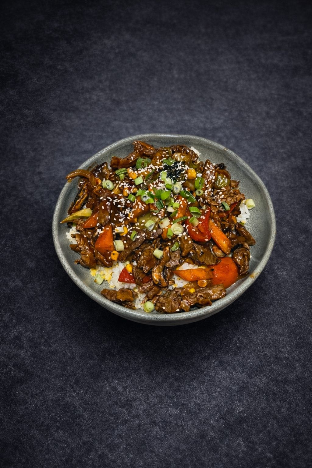 Sotelenmmiş julyen dana bonfile, Mantar, Kapya biber, Köy biberi, Kabak, Mısır, Havuç, Beyaz soğan, Taze soğan, Sarımsak, Brokoli, Taze fasulye, barbekü sos, Soya sos, Teriyaki sos