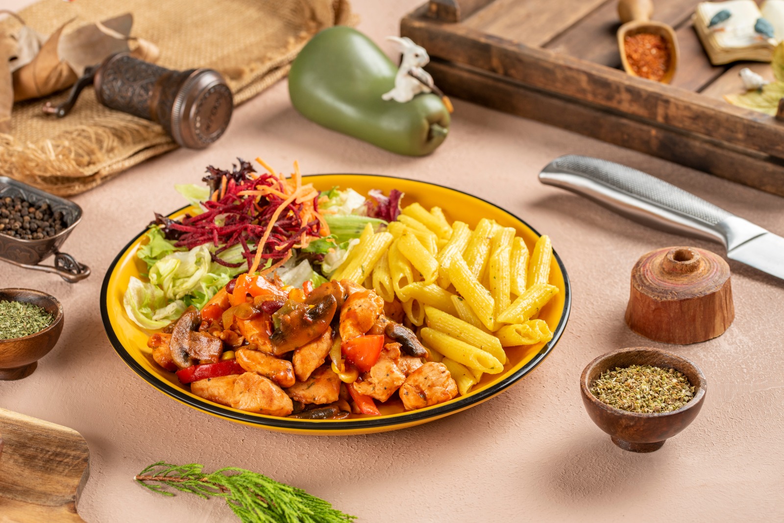 Barbekü sos ile sotelenmiş jülyen tavuk göğüs, krema, mantar, kırmızı biber, köy biberi. Özel soslu makarna, Akdeniz yeşillikleri ile