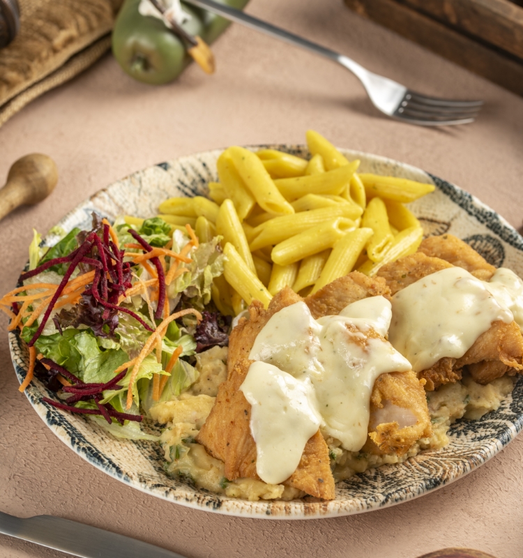 Özel pane harcı ile panelenmiş tavuk bonfile, patates püresi, chardonay sos, özel soslu makarna ve yanında akdeniz yeşillikleri ve sezar sos ile servis edilir.