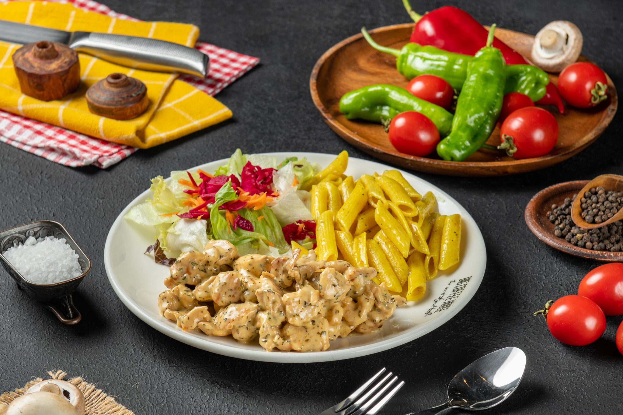 Dağ kekiği, kaşar peyniri, özel acı soslu küp tavuk, krema, yanında özel soslu makarna, Akdeniz yeşillikleri ile servis edilir.
