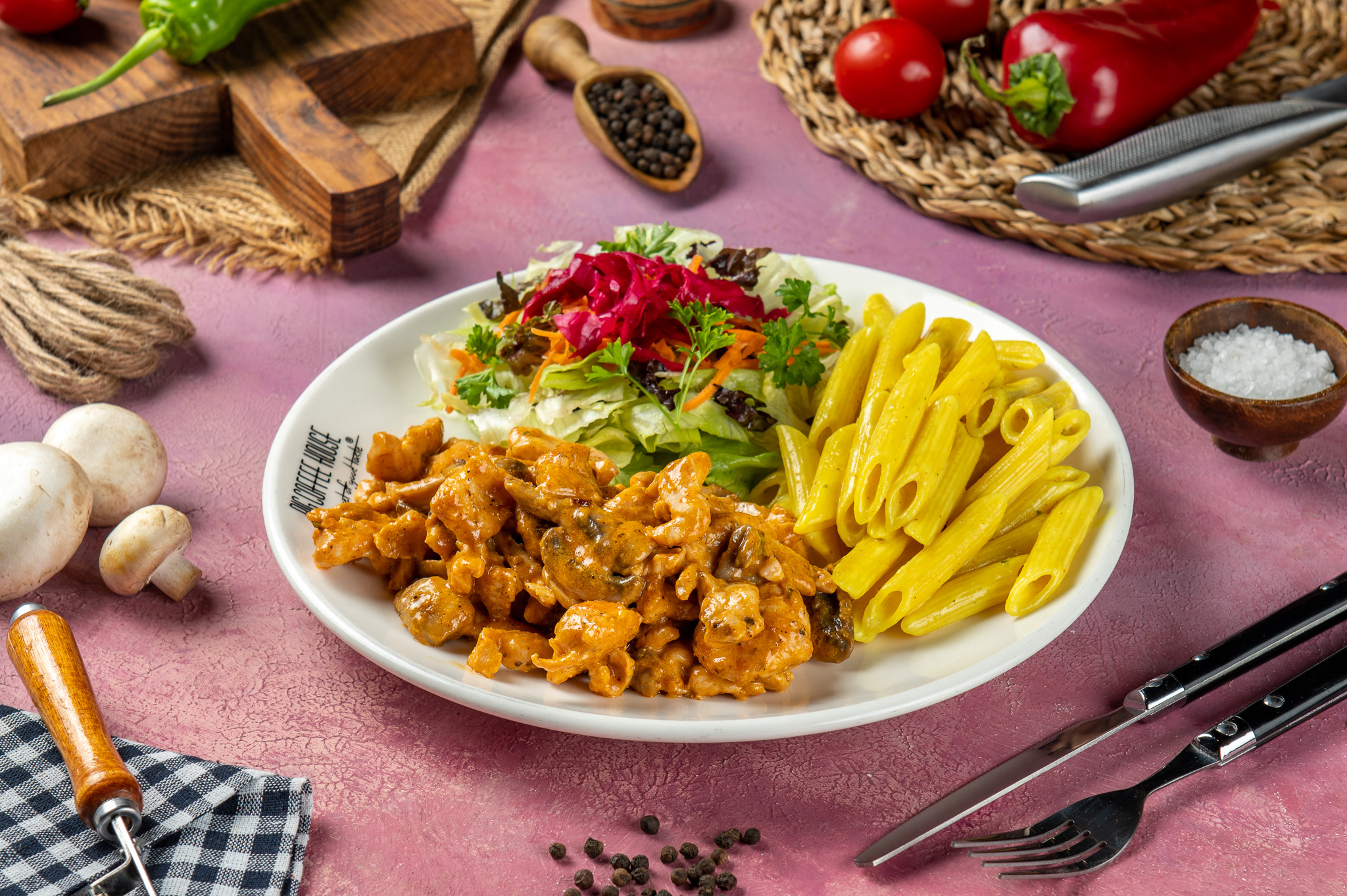 Sotelenmiş julyen tavuk, mantar, cajun baharatı, yanında akdeniz yeşillikleri ve makarna ile