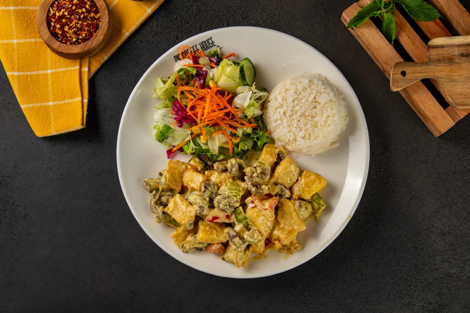 Sotelenmiş küp tavuk bonfile, Kırmızı kapya biber, Köy biberi, Soğan, Ananas, Krema, Köri, Hindistan Cevizi, yanında pilav ve Akdeniz yeşillikleri ile