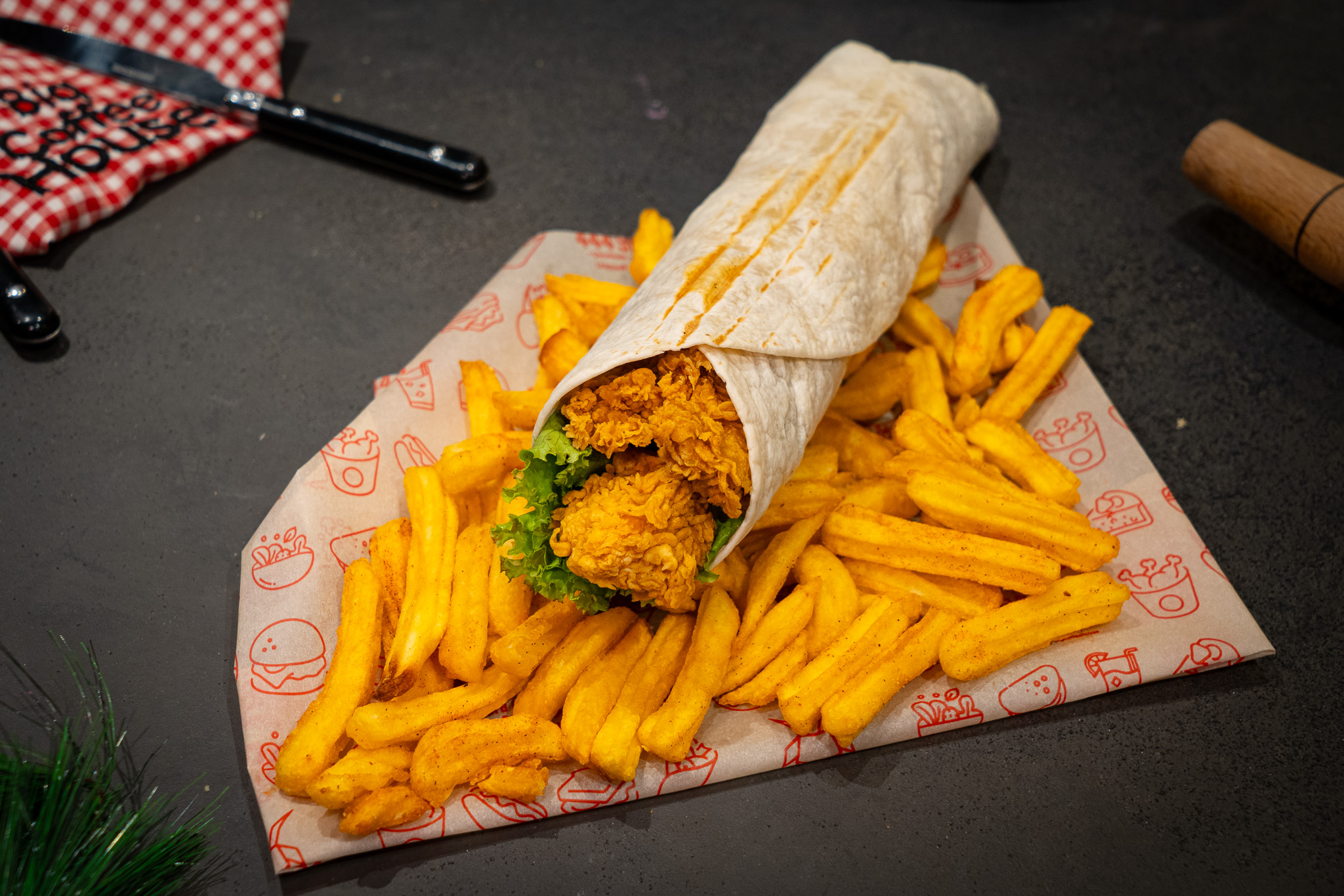 Tortilla ekmeği içinde jülyen çıtır tavuk, özel sos, kıvırcık marul, 4 adet nugget, soslu patates kızartması, Sezar sos