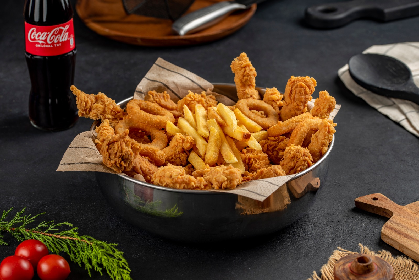 2 adet tavuk but, 4 adet tavuk kanat, 6 adet çıtır jülyen, 6 adet çıtır nugget, 4 adet soğan halkası, double patates kızartması, 2 adet Sezar sos, 2 adet Louisianan sos
