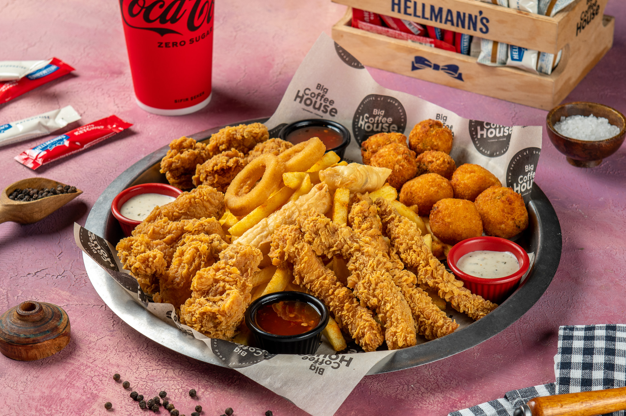 Nugget (4 adet), çıtır jülyen tavuk (4 adet), tavuk kanat (4 adet), çıtır humus topları (4 adet), çıtır mac & cheese topları (4 adet), sigara böreği (2 adet), soğan halkası (2 adet), sweet chili sos, sezar sos ve patates kızartması ile.