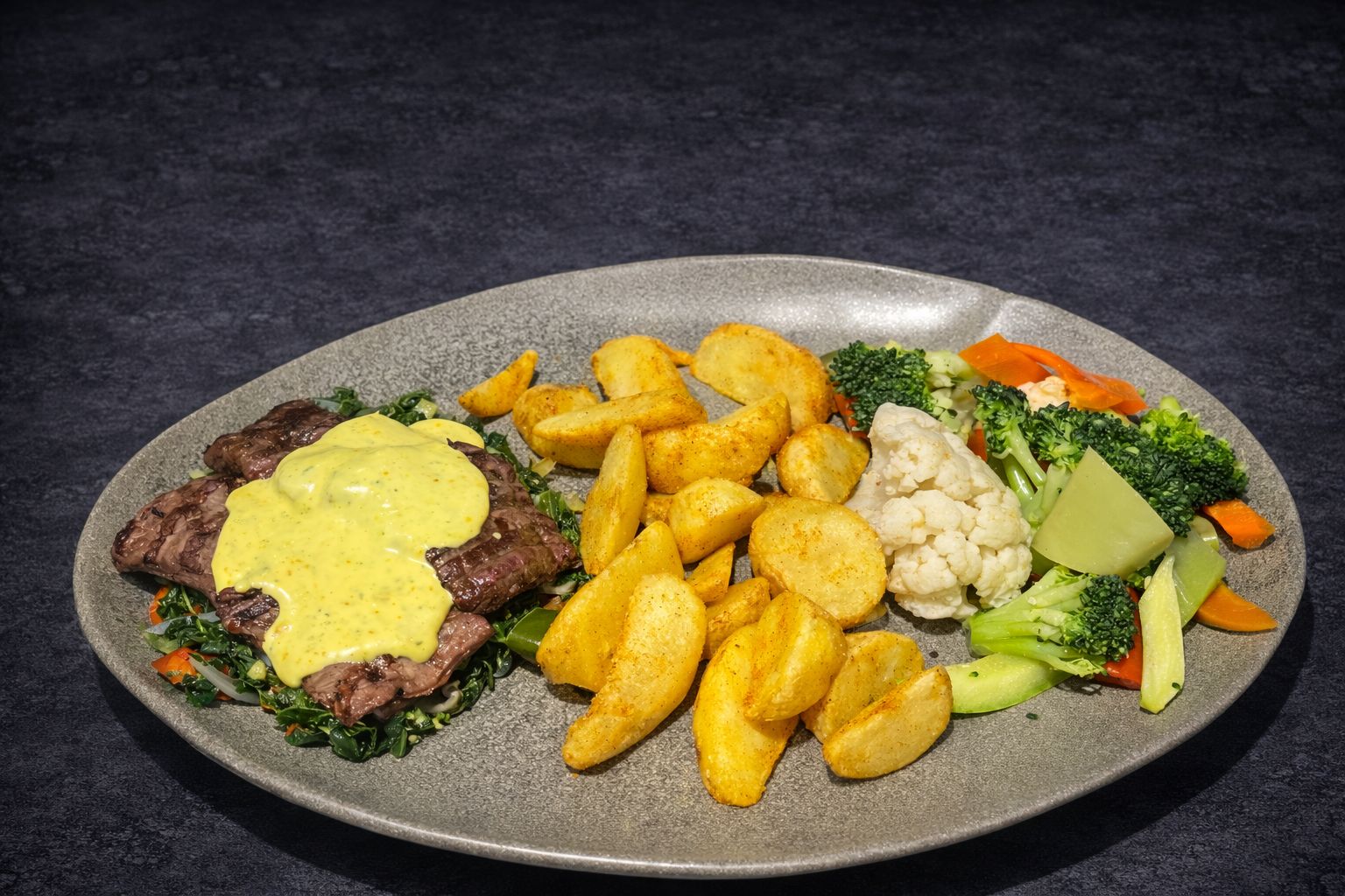 Özel Cafe De Paris sos ile ızgara dana bonfile,kavrulmuş ıspanak , mantar,soğan,kapya biber,köy biberi yanında brokoli,karnabahar,kabak,havuç ve yanında elma dilim patates ile