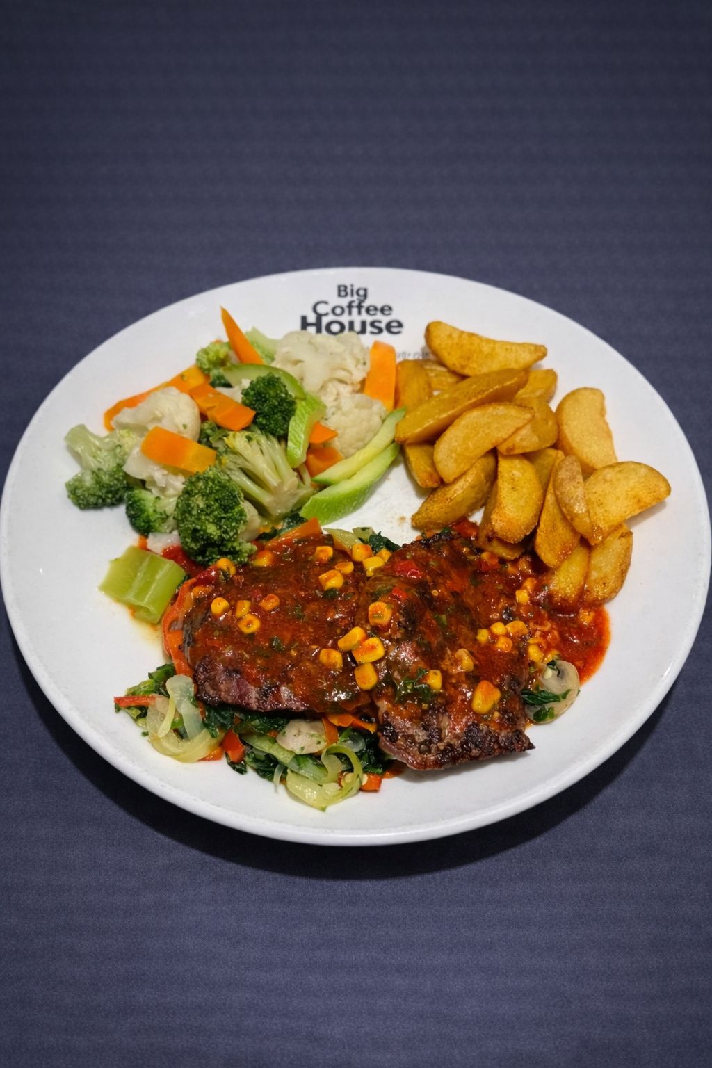 Meksikan sos ve mısır ile sotelenmiş ızgara dana bonfile, kavrulmuş ıspanak,mantar,soğan,kapya biber,köy biberi yanında brokoli ,karnabahar,kabak ,havuç ve elma dilim patates ile