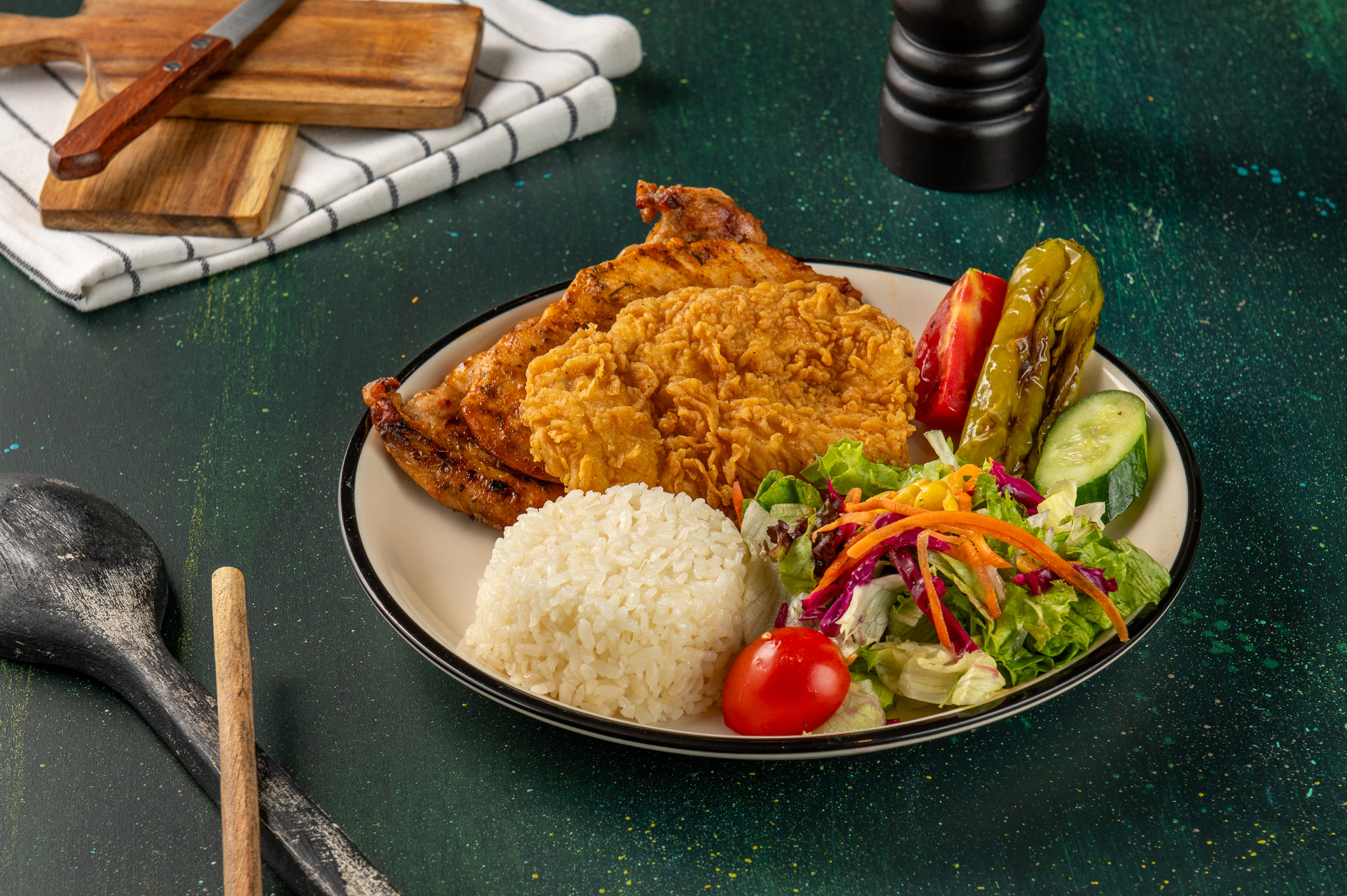 Izgara Tavuk Pirzola, Izgara Tavuk Bonfile, Çıtır Tavuk Bonfile, Izgara Domates, Biber, Yanında Arpa Şehriye Pilavı, Kuru Cacık, Akdeniz Yeşillikleri ile