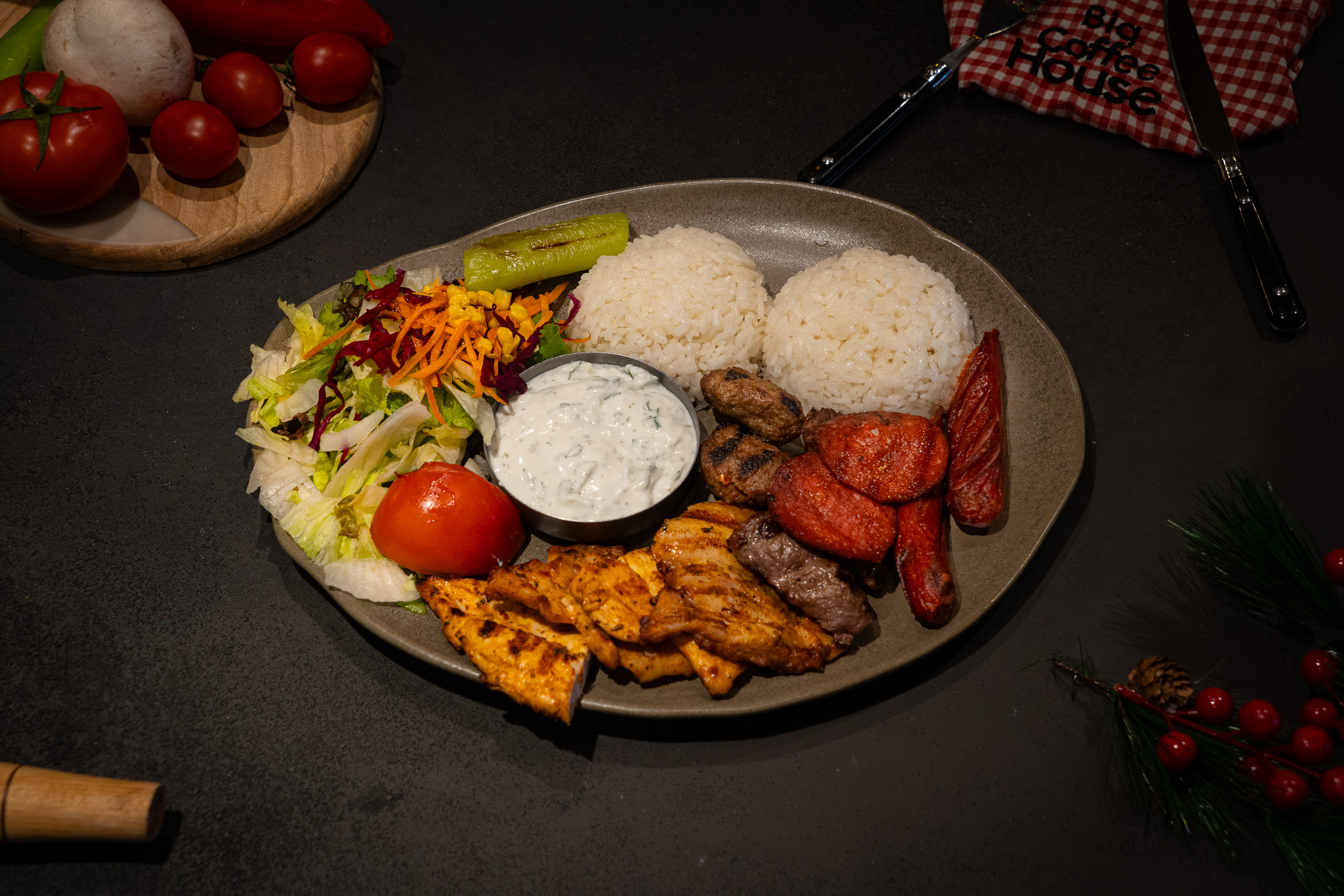 " Izgara Dana Bonfile, Izgara Köfte, Izgara Sucuk, Dana Frankurter Sosis, Izgara Tavuk Bonfile, Izgara Tavuk Pirzola, Izgara Domates, Biber, Yanında Arpa Şehriye Pilavı, Kuru Cacık, Akdeniz Yeşillikleri ile"