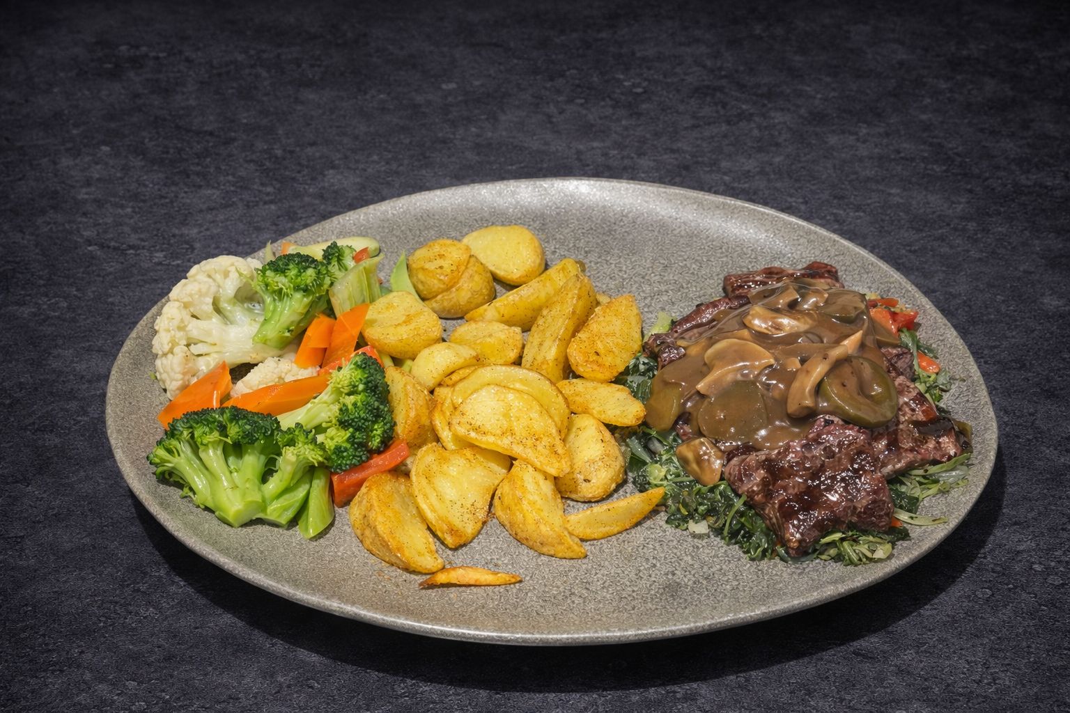 Mantar, turşu ve demi glace sos ile sotelenmiş ızgara dana bonfile,kavrulmuş ıspanak , mantar,soğan , kapya biber, köy biberi yanında brokoli ,karnabahar,kabak ,havuç ve elma dilim patates ile