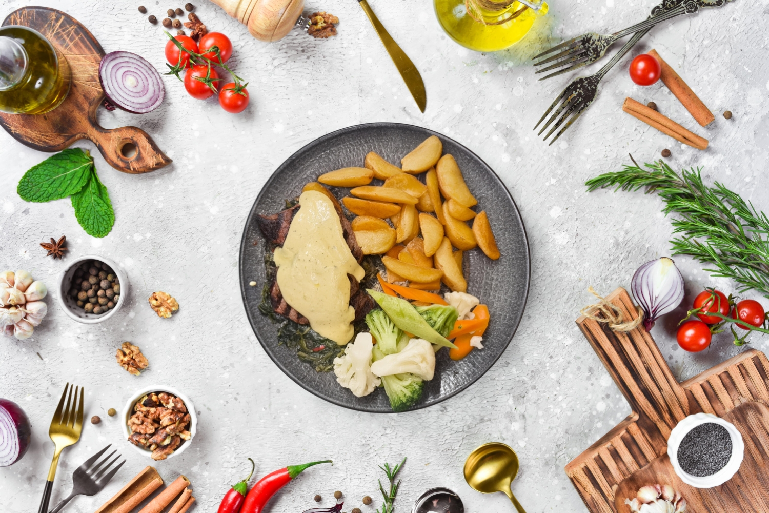 Izgara tavuk bonfile ile birlikte fırınlanmış ıspanak, mantar, soğan, krema, kaşar peyniri, chardonay sos, yanında pilav ve akdeniz yeşillikleri ile