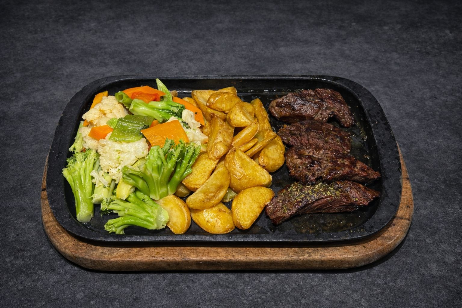 Tereyağlı ızgara dana bonfie yanında brokoli, karnabahar, kabak, havuç, elma dilim patates