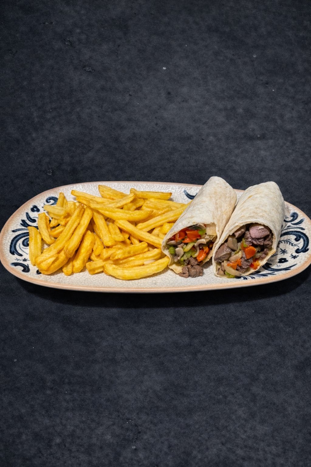 Sotelenmiş et, mantar, kapya biberi, köy biberi. Patates kızartması, ketçap, mayonez
